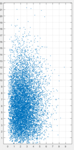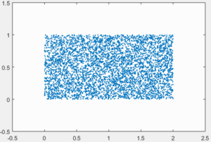Vamos fazer um teste disso, considere um conjunto de dados amostrados a partir de duas distribuições uniformes X =[0,2] e Y=[0,1]. Ao extrair 5000 amostras teremos o gráfico visto na Figura 7. A área ocupada pelo gráfico, naturalmente, é igual a 2, então é de se esperar que ao calcularmos a entropia desta massa de dados e elevarmos ela à base do logaritmo encontremos algo em torno de 2. De fato, a entropia resultante foi 0.9864 bits, ou seja,
