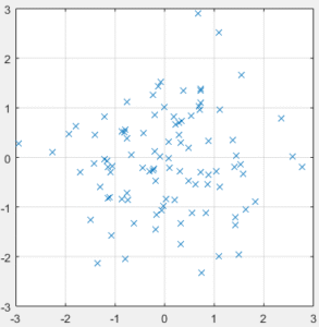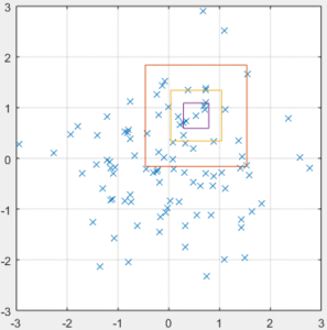 Considere a distribuição dada na Figura 4. Vamos definir uma célula de lado r ao redor de um ponto qualquer. Na Figura 5 podemos ver essa célula para três tamanhos diferentes de r, 1, 0.5 e 0.25. Para estimar o quão provável um ponto é, podemos contar quantos dos pontos estão situados dentro da célula de tamanho r centrada neste ponto. Este número é então dividido pelo total de pontos, obtendo um valor de densidade referente ao ponto em que a célula está centrada.