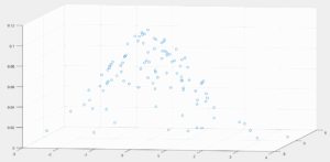 No nosso exemplo estamos usando um conjunto de pontos amostrados de uma distribuição normal unitária. Assim, naturalmente, os pontos que estiverem próximos à origem do plano terão uma densidade maior que os pontos mais afastados. Na Figura 6 podem ser vistos os valores de densidade para os pontos vistos nas Figuras 4 e 5 para uma célula de lado r=1.