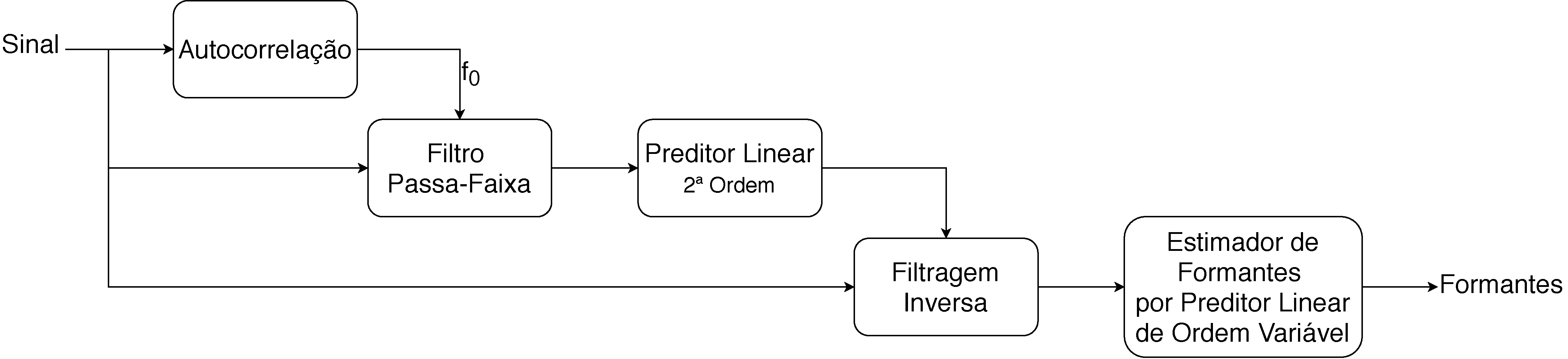 . Um preditor linear de ordem 2 ficava responsável por estimar os coeficientes que era utilizado para aplicar uma filtragem inversa no sinal original. Após a filtragem inversa, a predição linear de ordem ajustável era executada para a estimação das formantes. Todo esse processo é ilustrado pelo diagrama de blocos apresentado na Figura 2.