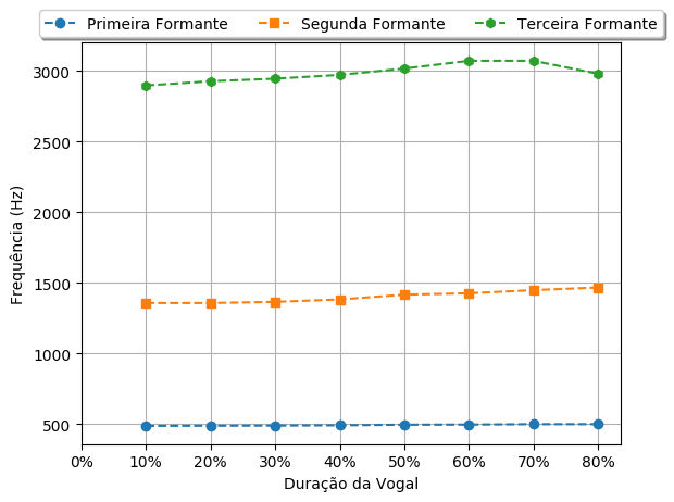 A base disponibilizada por Hillenbrand3 et al. [3] é uma base de dados em que foram registrada vozes de 45 homens, 48 mulheres e 46 crianças4 (27 meninos e 19 meninas) pronunciando 12 palavras, escolhidas para evidenciar determinadas vogais (Ex: /i/=heed; /e/=hayed; /ʊ/=hood; etc.). Nessa base, as 3 primeiras frequências formantes das vozes emitidas foram rotuladas manualmente e disponibilizadas em um arquivo a parte. Os valores foram rotulados para uma quantidade igual de instantes de tempos em cada voz, com base no tempo de duração da vogal em cada gravação, de modo que os valores foram rotulados de 10% em 10% da duração da vogal, até 80% (i.e. 10%, 20%, 30%, …, 80%). Na Figura 5 é ilustrada os valores das formantes ao longo do tempo de duração da vogal para um sinal exemplo.