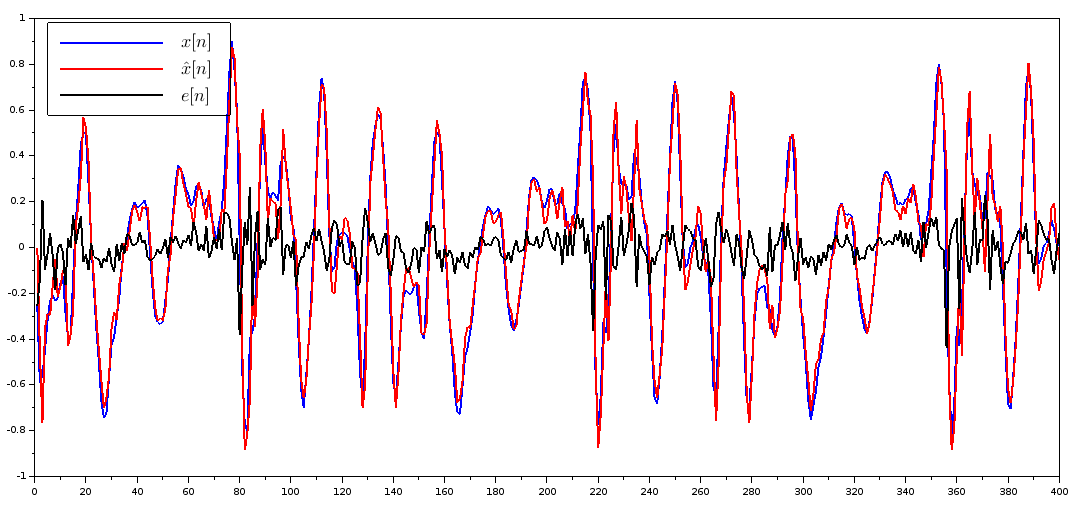 xhat=M*A; plot(x(1:400)) plot(xhat(1:400),'r') plot(e(1:400),'k')