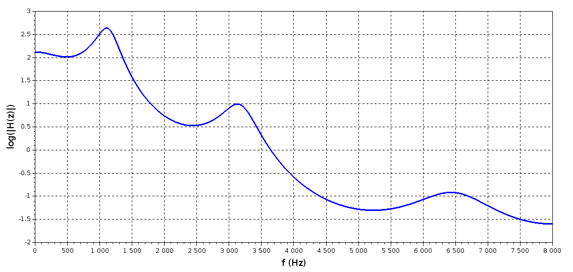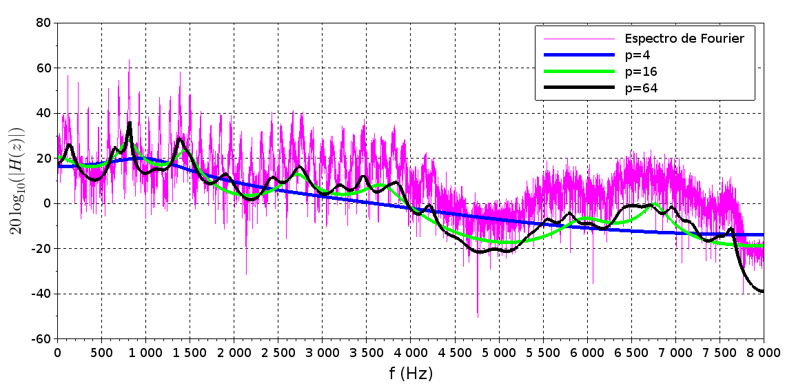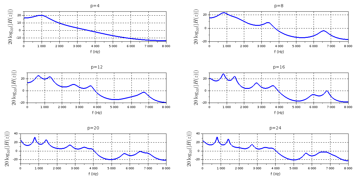 Um exemplo interessante é a aplicação para sinais de voz (que por acaso é o que estamos testando). O sinal de voz é o resultado de uma excitação sonora, que ocorre na glote, ressonando em um tubo acústico que liga a glote até os lábios, denôminado trato vocal. As frequências de ressonância do trato vocal são denominadadas “formantes”. As 3 formantes mais relevantes oscilam em torno de 500, 1500 e 2500 Hz (variando de acordo com a vogal e com características anatômicas e fisiólogica de quem fala), respectivamente. Logo, uma ordem adequada para o preditor deve garantir uma estimação de uma resposta em frequência que englobe, ao menos, picos em valores razoáveis para as três primeiras formantes.