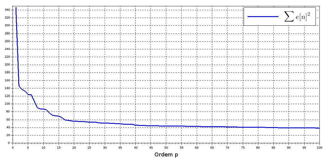 variando de 1 a 100.Podemos observar que o erro quadrático segue diminuindo à medida em que a ordem aumenta. Então se o critério para a escolha da ordem fosse o menor erro quadrático, a maior ordem possível seria sempre escolhida.