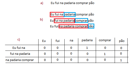 A graça da cadeia de Markov (pelo menos para essa aplicação) não é prever o próximo passo, e sim modelar como o sistema sem se comportado durante muito tempo. Para fazer isso, iremos observar uma sequência de eventos. A Figura 1 representa um esquema de como modelar um preditor de palavras para um corretor automático. Considere a Figura 1.a, nela temos uma sequência de acontecimentos (palavras digitadas) que aconteceram em instantes seguidos. Se considerarmos que queremos modelar o preditor com uma cadeia de Markov de ordem 3, iremos considerar as três últimas palavras digitadas para sugerir uma nova palavra. O modelo no entanto, é feito pegando blocos de palavras (chamarei esses blocos daqui para frente de anagramas) do tamanho “ordem” e vendo qual a próxima palavra, como pode ser visto na Figura 1.b. Essas transições entre anagramas e novas palavras é gravada em uma tabela de transição em que as linhas representam os anagramas e as colunas representam as novas palavras, como pode ser visto na Figura 1.c. Os números na tabela representam a ocorrência da palavra quando o anagrama é escrito.