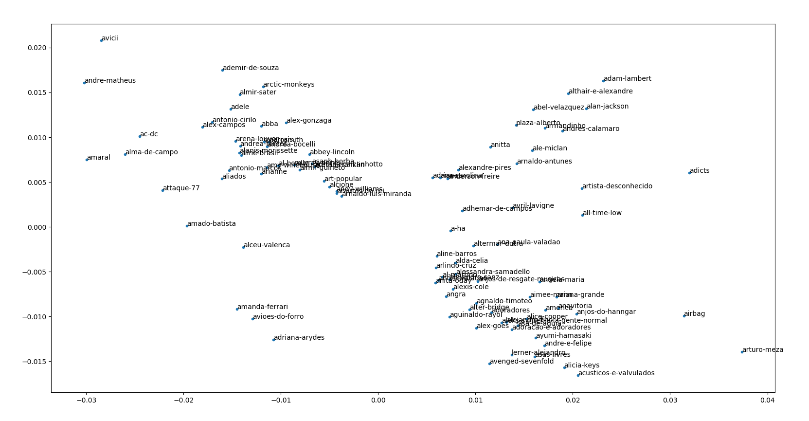 5- Com umas mágicas do python (matlab deve fazer também) plotei os pontos de referente a cada artista junto com seu nome. É isso que você pode ver na Figura 1.