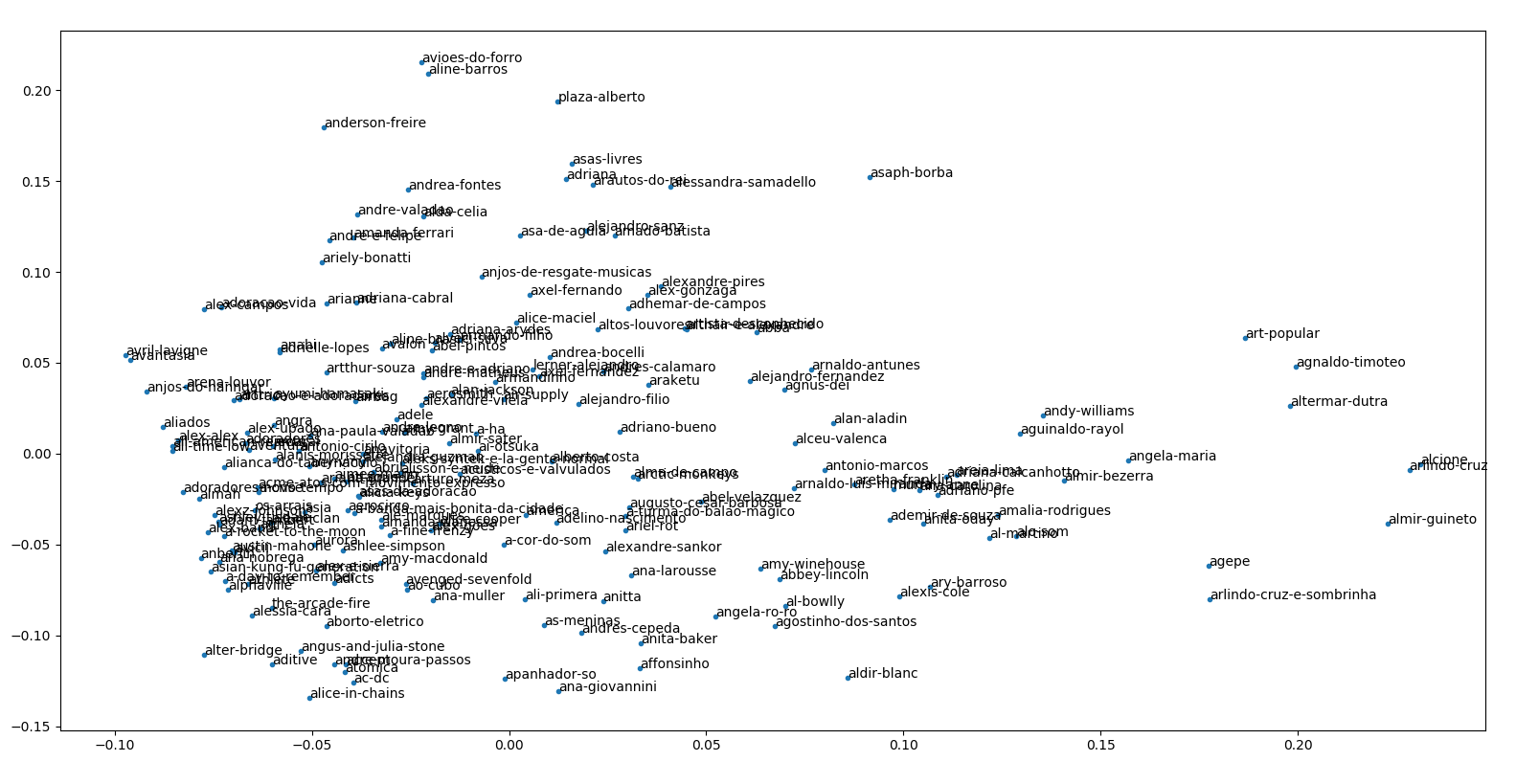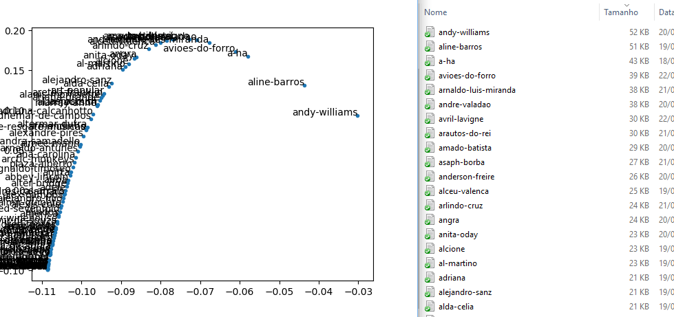Feito isso, juntei os modelos de 100 artistas em uma matriz de dados e reduzi suas dimensões usando PCA, MDS e a decomposição SVD. Plotei esses valores reduzidos e os resultados foram todos igualmente esquisitos e podem ser visualizados nos relatórios passados, ou nas descrições mais abaixo.
