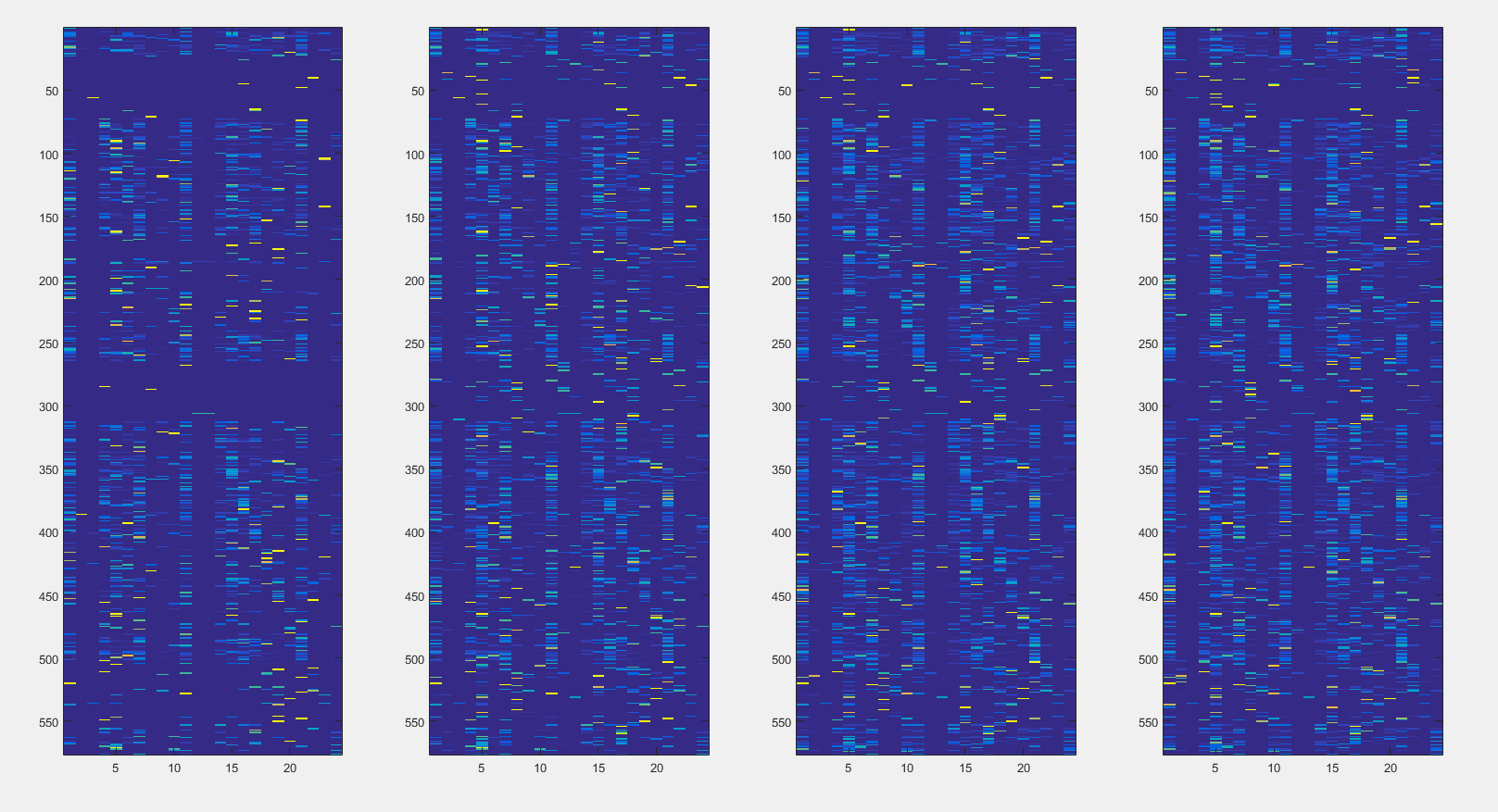 Desta vez resolvi observar os modelos usando a função imagesc(), para ver se percebia algo a mais. O resultado desta observação pode ser vista na Figura 4. Muito melhor de enxergar as coisas né?! Então, é mesmo, inclusive, você pode até perceber que tem uns padrões se repetindo não é? A diagonal do modelo vai ficando cada vez mais marcada não é? Aí você talvez, jovem sagaz, já tenha pensado no erro que eu cometi. Você está zerando a matriz de transição no início da análise de cada artista?! Então …… eeer….. não estava ?. Agora estou ?. Esse foi o erro 2.