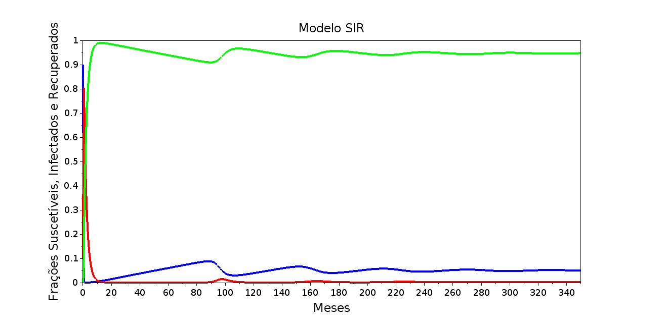 , o gráfico mostra oscilações nas frações dos estados, isso pode ser entendido do seguinte modo: como o número básico de reprodução é maior que um, espera-se que um infectado tem capacidade de infectar em média mais de uma pessoa no período infeccioso. No entanto ele consegue transmitir apenas para indivíduos suscetíveis, isso implica que em um surto inicial o número de suscetíveis cai muito, fazendo com que os contatos entre infectados e suscetíveis venham em menor quantidade. Na continuidade do processo, pessoas nascem, aumentando o número de suscetíveis a valor crítico que geram novos pequenos surtos, como pode ser visto na Figura 3.