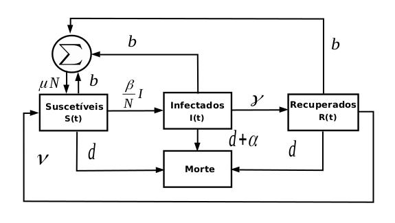 . Chegamos, finalmente, ao modelo SIR clássico (prometo parar com a modelagem, a partir de agora é análise de sinais), cabendo uma pequena pausa para entender o que está representado em (2): novos suscetíveis chegam a taxa de