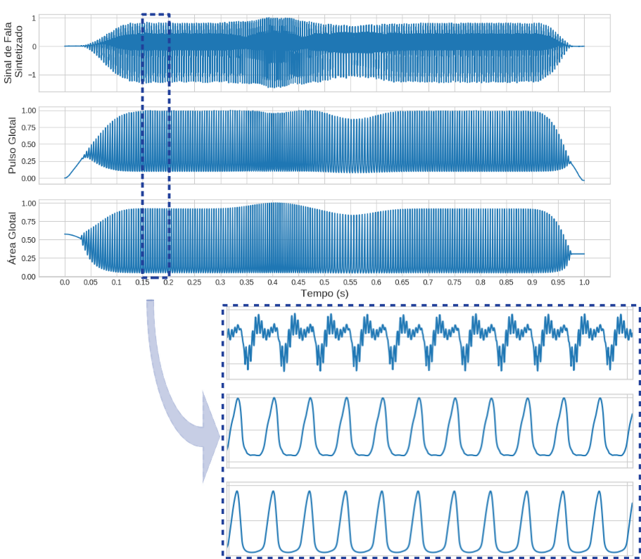 Neste repositório um arquivo ‘.wav’, a uma taxa de 44100 amostras/s, com três canais é disponibilizado: no primeiro canal se encontra o sinal sintetizado, no segundo canal está contido o pulso glotal que gerou esse sinal e no terceiro canal o que se tem é o sinal da área entre as pregas vocais ao longo do tempo. Na Figura 2 um exemplo de um arquivo do repositório é ilustrado, mostrando separadamente os sinais de cada canal. No áudio após a figura é possível escutar o sinal do primeiro canal do arquivo exemplificado, ou seja, o sinal de voz sintetizado.