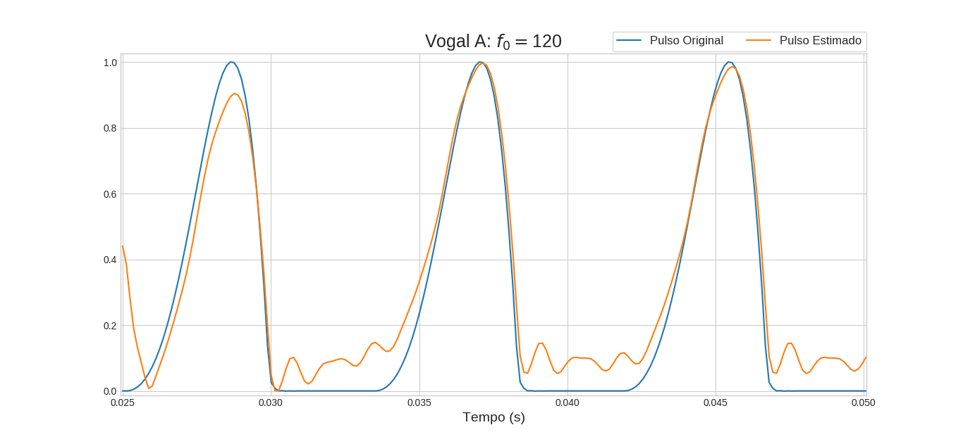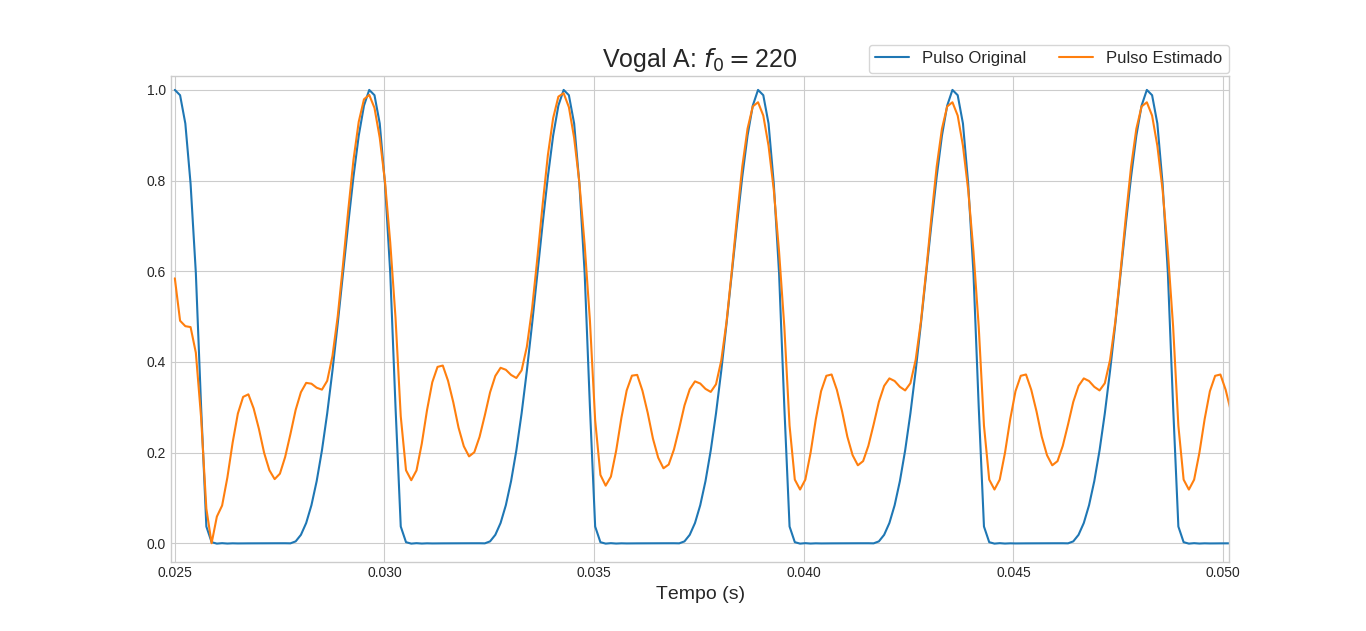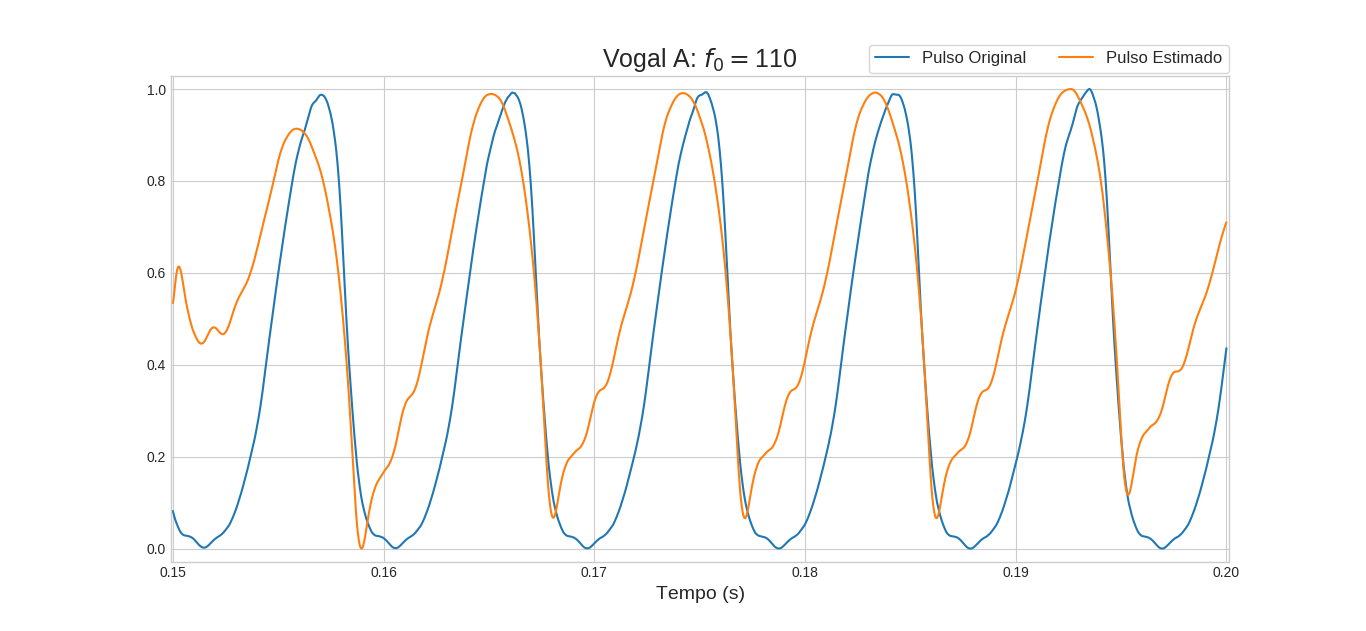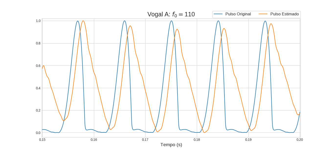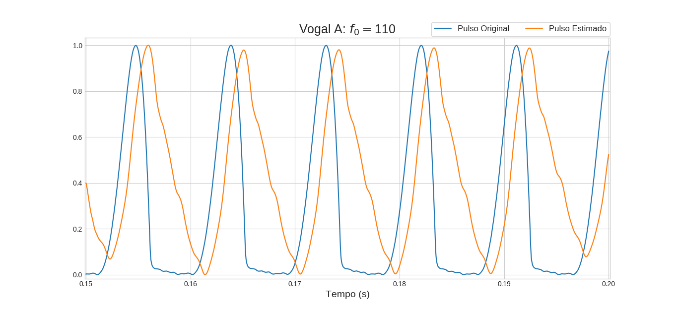 Nos exemplos do repositório 1 é possível observar que há uma boa adequação temporal dos instantes de abertura e fechamento da glote14, apresentando mais inadequações na estimação durante a fase fechada da glote. Essas inadequações são mais discrepantes ainda quando olhamos para sinais de alta frequência fundamental, o que é uma dificuldade prevista pelos autores do IAIF[9], e são reforçadas pelos valores calculados do SNR.